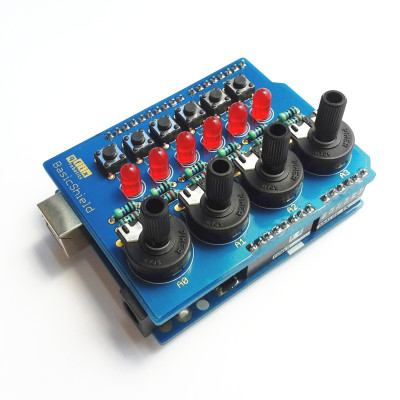 Das BasicShield ist eine Erweiterungsplatine für den Arduino UNO (oder kompatible Controllerboards), mit dem die digitalen und analogen Ein- bzw. Ausgänge sehr einfach untersucht und getestet werden können. Das Shield besitzt
